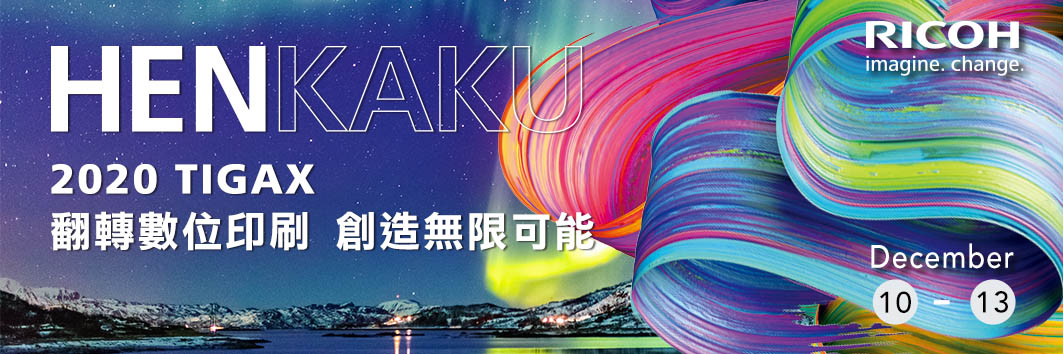數位印刷市場領導品牌台灣理光 RICOH Taiwan,今年以「HENKAKU」做為 TIGAX2020 的主題,「HENKAKU」即為日文中的變革,理光希望在數位印刷領域,給您耳目一新的展覽體驗,帶您倘佯於數位印刷的無限可能。