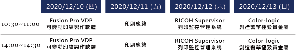 此外,展覽期間的每日 10:30-11:00 及 14:00-14:30,理光將針對 RICOH SuperVisor、Fusion Pro VDP 印紋製作軟體、Color-Logic、印刷趨勢等議題,舉辦現場研討會,誠摯邀請您前來一同交流、參與!