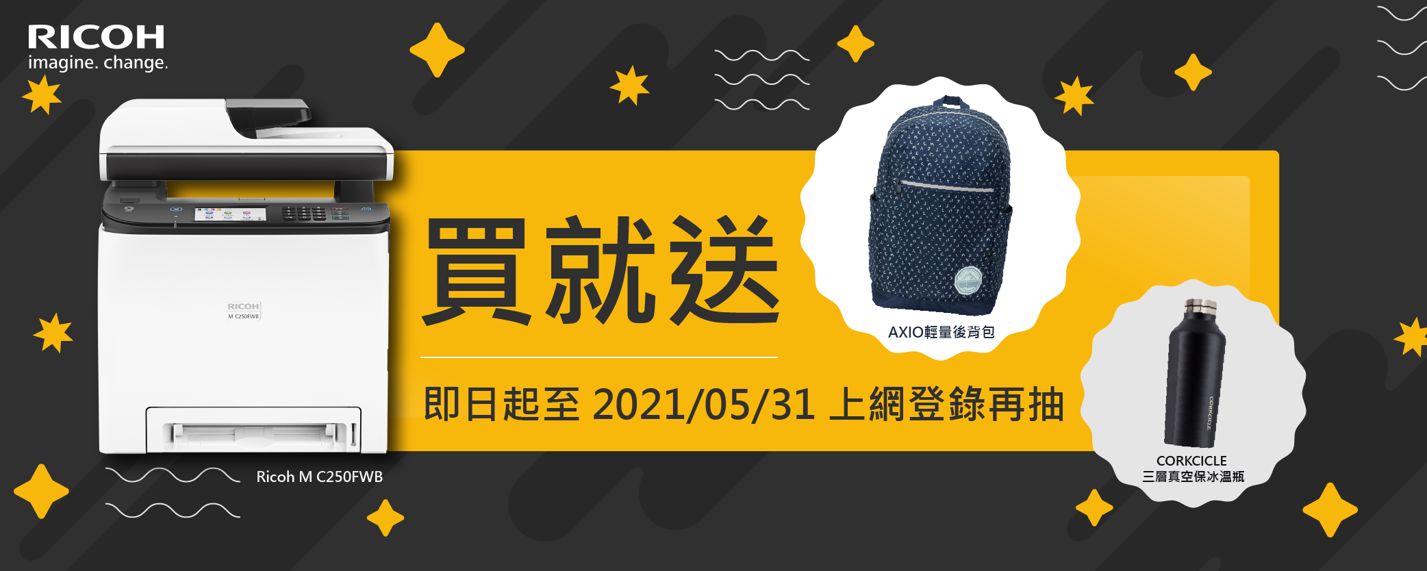 購買指定機種(Ricoh M C250FWB),即日起至 - 2021/05/31,上網登錄可享雙重送: