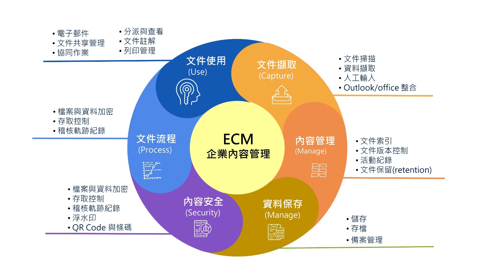 ECM 用於降低企業文件相關聯風險,如治理風險,法律風險等,確保合規、文件資訊安全,並提高經營的效率。