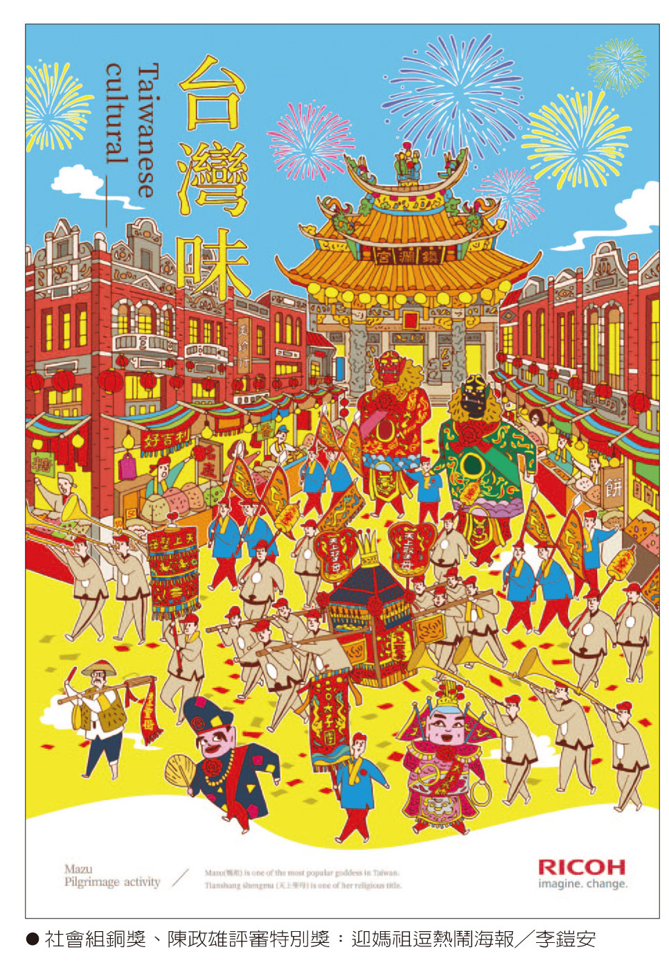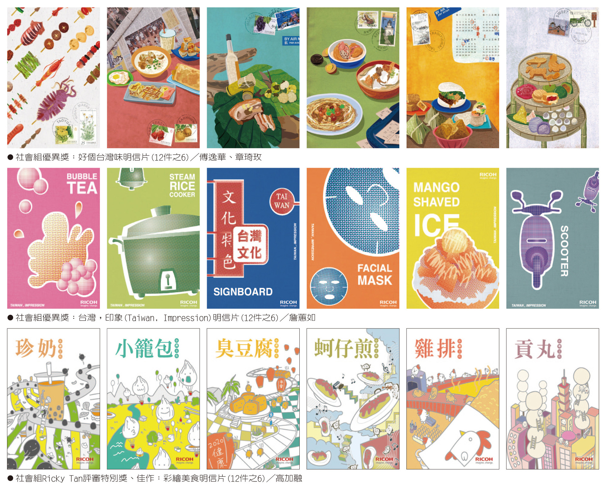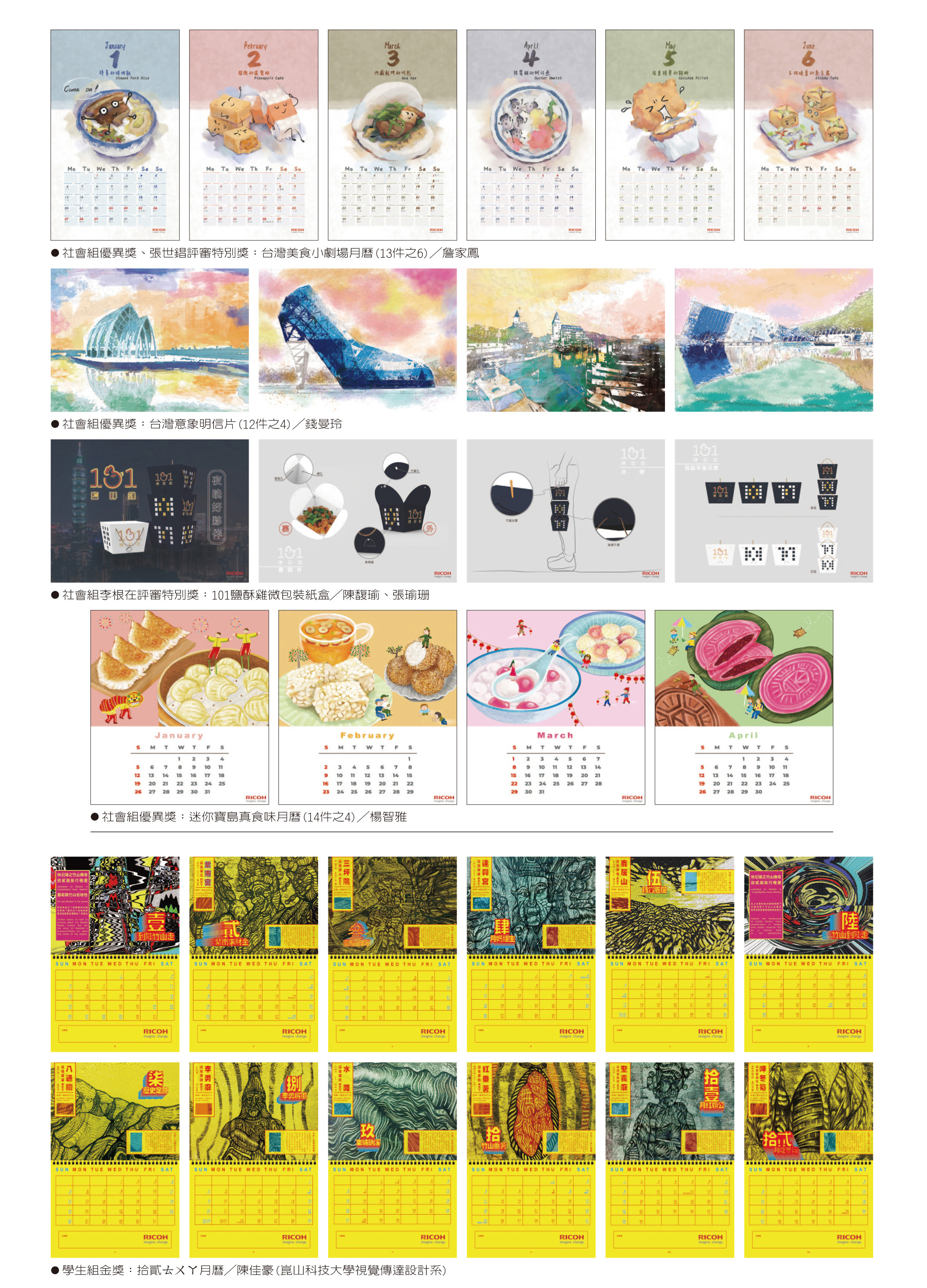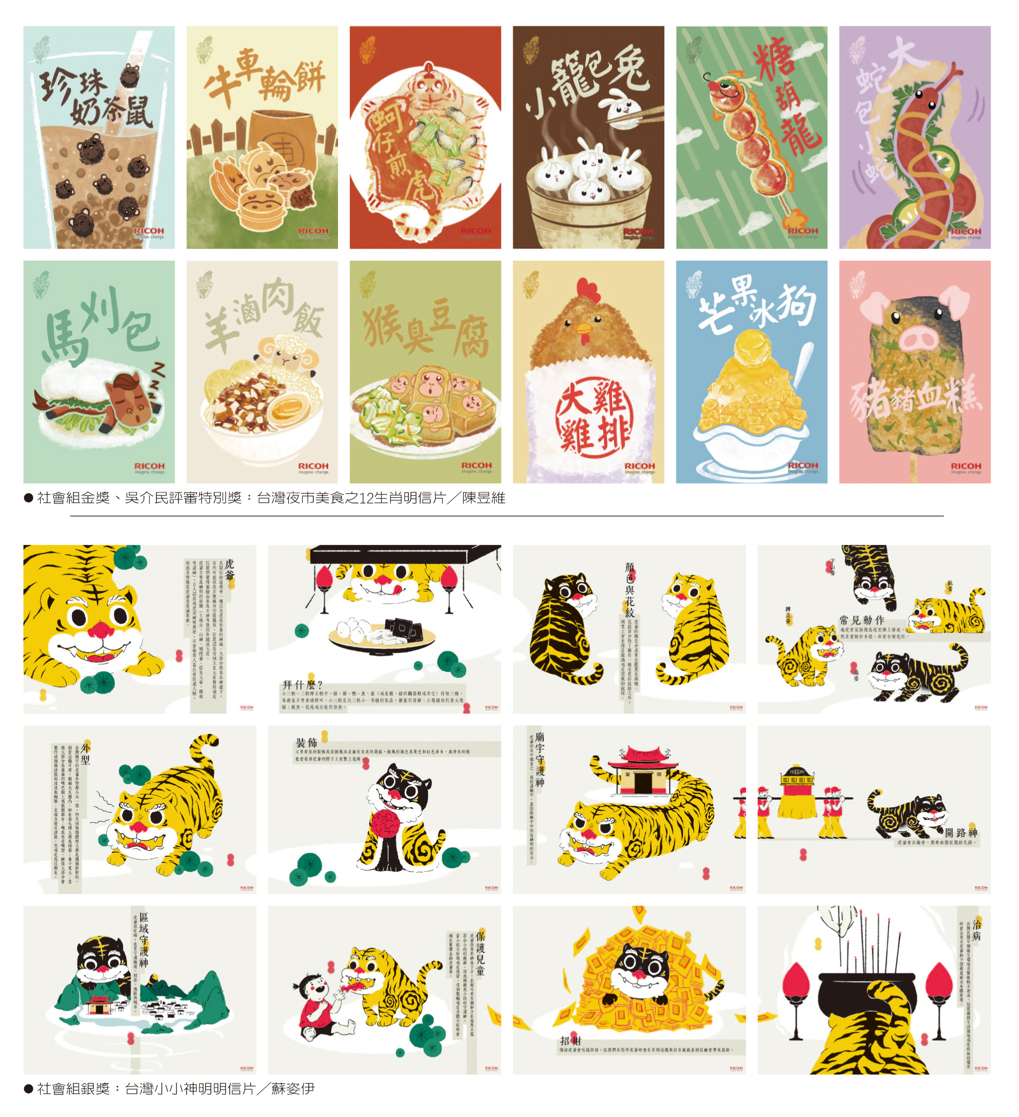 首屆「理光盃數位平面設計大賽」社會組得獎名單:(1)金獎╱陳昱維(台灣夜市美食之12生肖明信片)。(2)銀獎╱蘇姿伊(台灣小小神明明信片)。(3)銅獎╱李鎧安(迎媽祖逗熱鬧海報)。(4)優異獎╱傅逸華及章琦玫(好個台灣味明信片)、詹蕙如(台灣,印象明信片)、楊智雅(迷你寶島真食味月曆)、詹家鳳(台灣美食小劇場月曆)、錢曼玲(台灣意象明信片)。