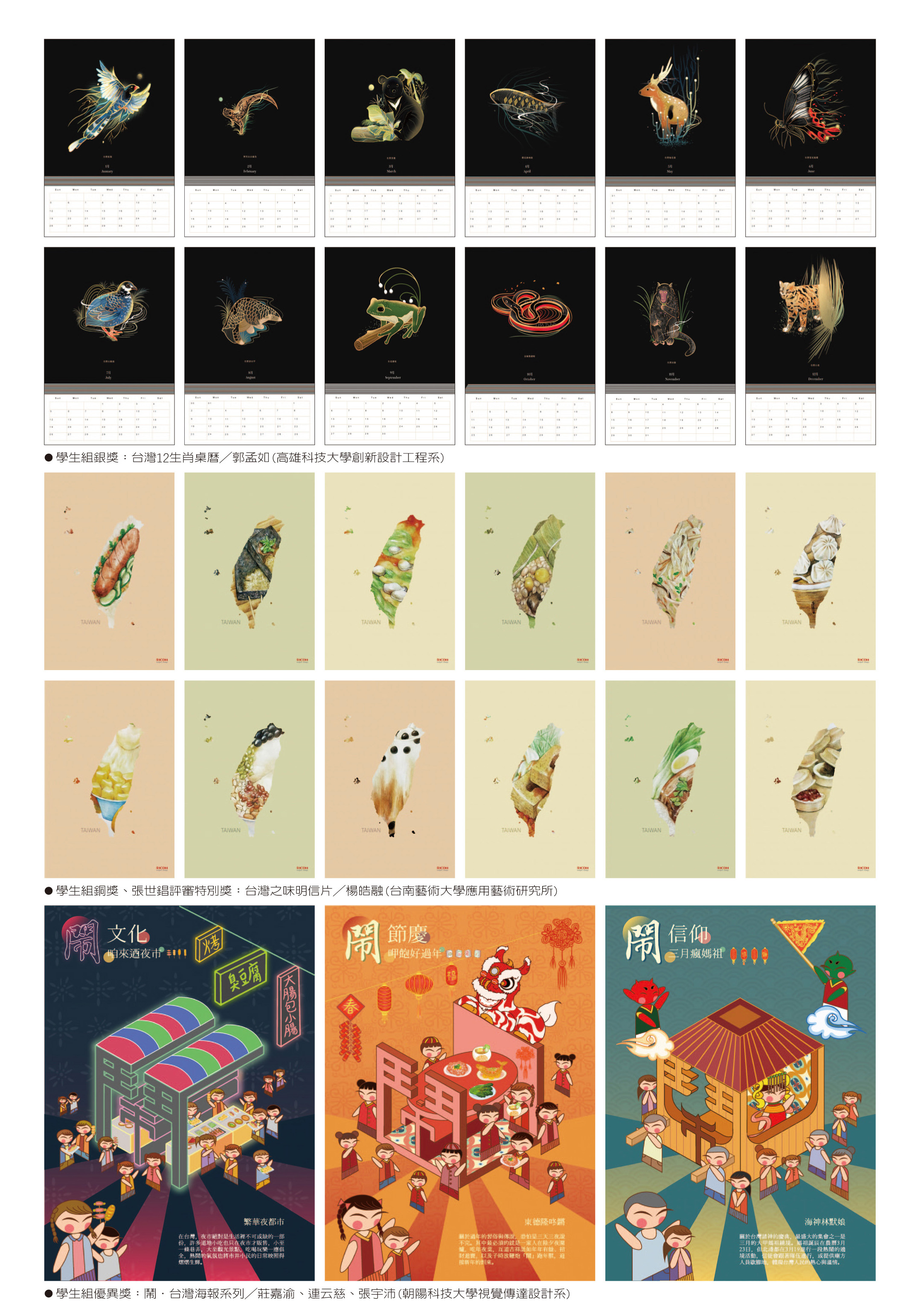 學生組得獎名單:(1)金獎╱崑山科技大學視覺傳達設計系陳佳豪(拾貳ㄊㄨㄚ月曆)。(2)銀獎╱高雄科技大學創新設計工程系郭孟如(台灣12生肖桌曆)。(3)銅獎╱台南藝術大學應用藝術研究所楊皓融(台灣之味明信片)。(4)優異獎╱雲林科技大學視覺傳達設計系吳汶慧、葉湘庭、張羽岑(透視食間海報系列)、雲林科技大學創意生活設計系盧泰源(台灣節海報)、朝陽科技大學視覺傳達設計系莊嘉渝、連云慈、張宇沛(鬧.台灣海報系列)、雲林科技大學創意生活設計系陳玟臻(饗艷海報)、崑山科技大學視覺傳達設計系陳柔庭(月與習俗節慶月曆)。