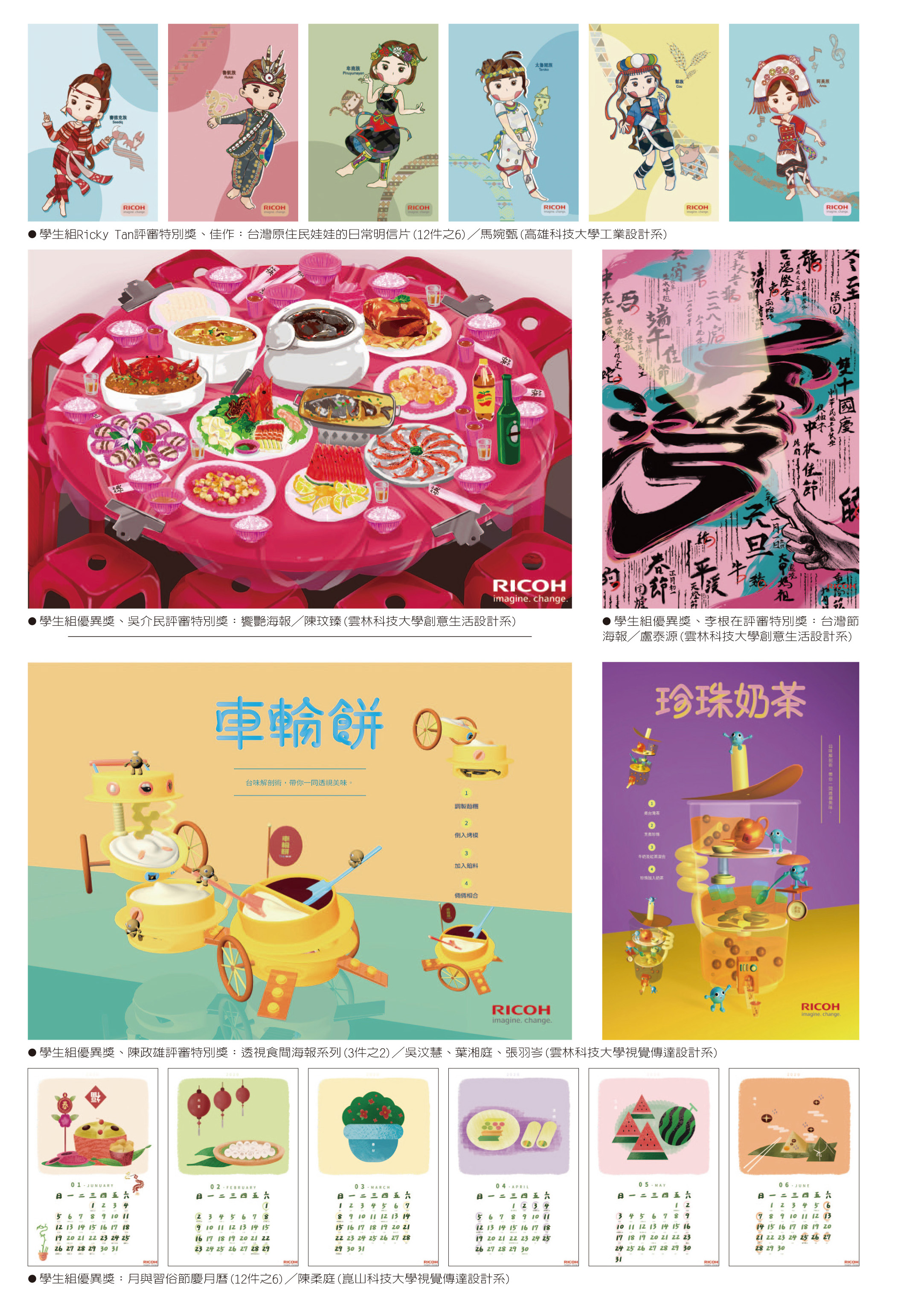 首屆「理光盃數位平面設計大賽」社會組得獎名單:(1)金獎╱陳昱維(台灣夜市美食之12生肖明信片)。(2)銀獎╱蘇姿伊(台灣小小神明明信片)。(3)銅獎╱李鎧安(迎媽祖逗熱鬧海報)。(4)優異獎╱傅逸華及章琦玫(好個台灣味明信片)、詹蕙如(台灣,印象明信片)、楊智雅(迷你寶島真食味月曆)、詹家鳳(台灣美食小劇場月曆)、錢曼玲(台灣意象明信片)。